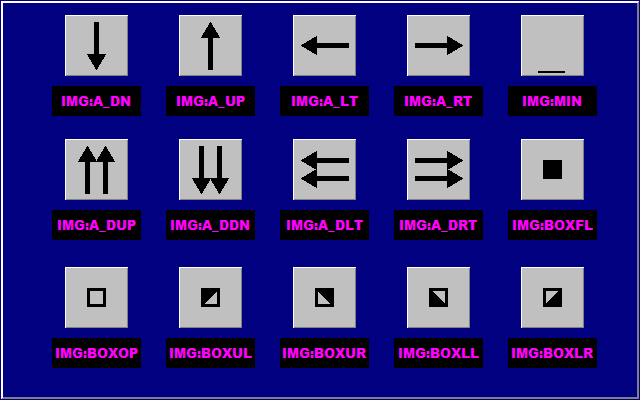 There is an override lable {IMG:*} that will display alternate images. Currently supported images (drawn via internally handled low-level graphic calls) are: