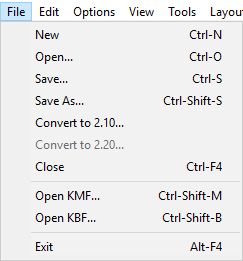 This will open a KMF file from pre 2.00 versions. There is no editing available for KMF files, and for display purposes, a matching pre 2.00 KBF file must be available. For more information on KMF Files and details on this option, see KMF File Notes.