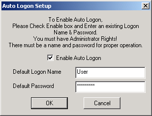 Check Enable Auto Logon On to enable the automatic logon of the Default User / Default Password combination. You must enter a valid User Name along with the proper Password to ensure proper operation of the Automatic Logon.